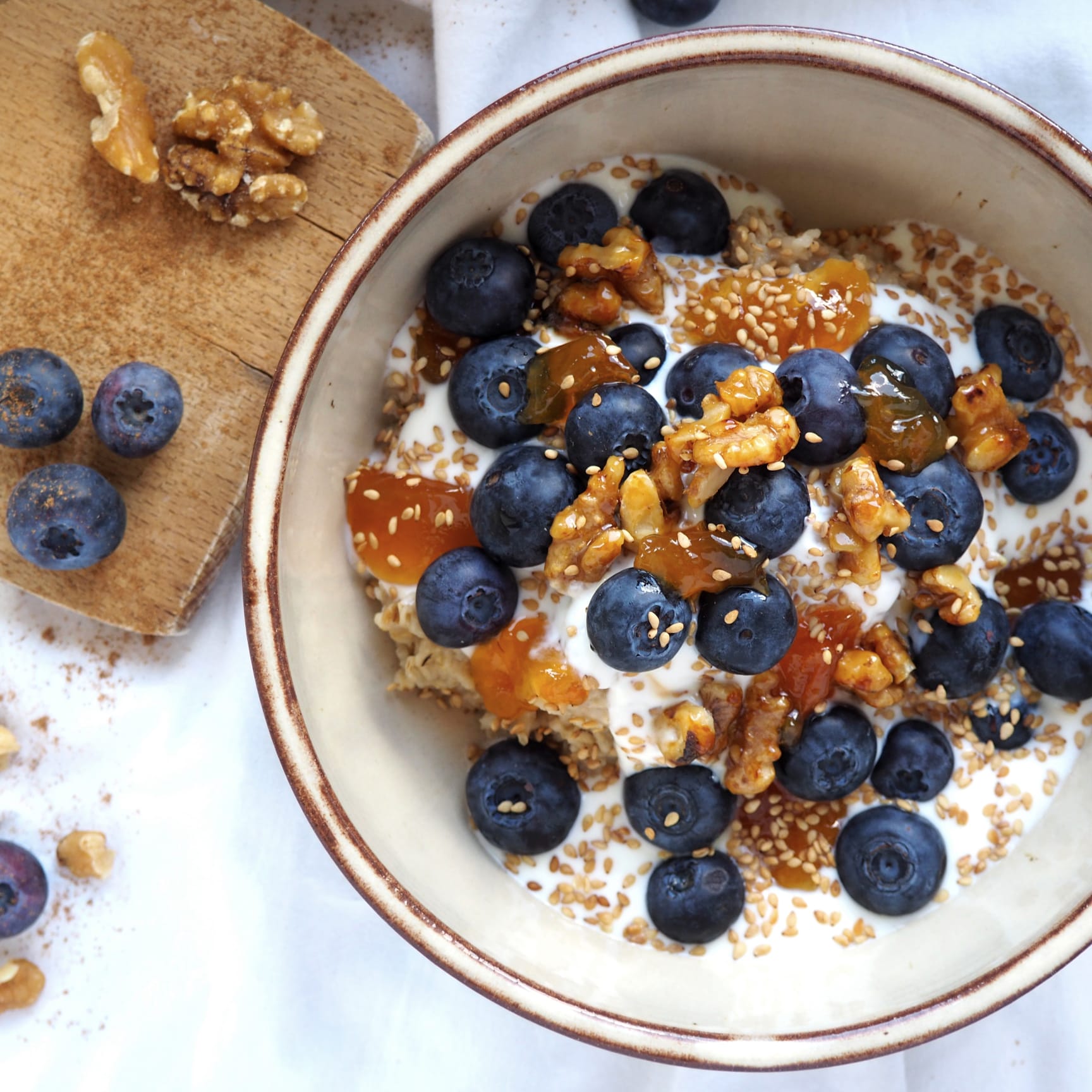 Nachdem jetzt schon öfter die Frage kam, ob wir im Herbst und Winter unseren Porridge wieder haben, wollen wir euch nicht mehr länger warten lassen und starten ab heute damit ganz offiziell in den Herbst! 💙 Die nächsten Wochen gibt es unseren Porridge mit frischen Heidelbeeren, karamellisierten Walnüssen, geröstetem Sesam und hausgemachter Marmelade aus weißen Pfirsichen. 🍑🌾💙Button